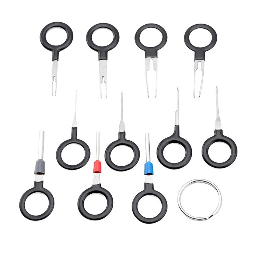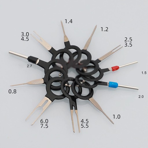 Uniwersalny zestaw 11 sztuk wyjmaków do demontażu pinów (konektorów). Komplet składa się z 3 rodzajów kluczy (pojedynczych, podwójnych oraz rurkowych) o zróżnicowanej grubości. Doskonale nadają się do napraw kostek elektrycznych i instalacyjnych. Obowiązkowe wyposażenie wszystkich osób zajmujących się naprawami samochodowej elektryki czy sprzętu komputerowego.
