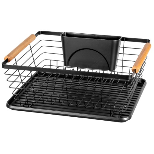 Suszarka do naczyń cechuje wysoka jakość a także trwała i metalowa konstrukcja. Tacka wykonana z żywicy zabezpiecza blat przed zamoczeniem. Zestaw zawiera również plastikowy, dwukomorowy ociekacz na sztućce. Metalowa czarna suszarka z drewnianymi uchwytami pasuje do każdej kuchni.