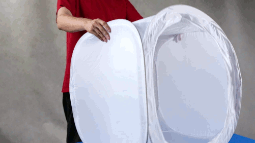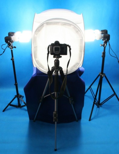 Wygodę pracy znacznie zwiększa demontowana przednia ściana namiotu, posiadająca otwór na obiektyw aparatu. Namiot najlepiej oświetlać z dwóch kierunków (prawa i lewa strona) lub z trzech kierunków, dodając światło z góry niwelując jakiekolwiek pozostałe cienie.