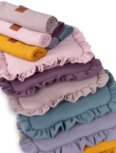 KOMPLET MUŚLINOWY KOC OTULACZ PODUSZKA Z FALBANKĄ