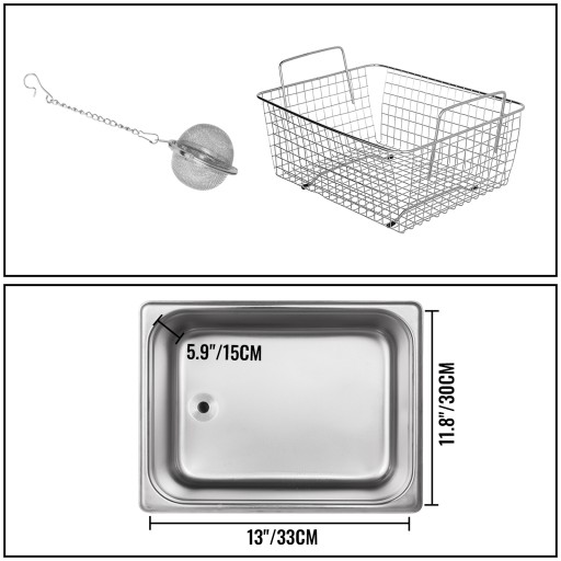 Pojemność zbiornika: 15L; Materiał dużego kosza: stal nierdzewna; Używając kosza do czyszczenia biżuterii w kształcie kulki, używaj wody z kranu do ogólnego czyszczenia, możesz również dodać 5-10 ml detergentu do wody, aby poprawić efekt prania, jeśli to konieczne.