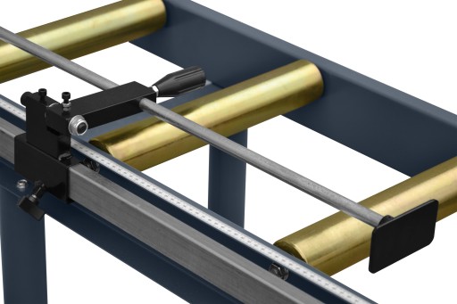 Podajnik rolkowy z możliwością regulacji wysokości. Podajnik wyposażony w wytrzymałe stalowe łożyskowane rolki oraz przymiar umożliwiający pomiar długości cięcia.
