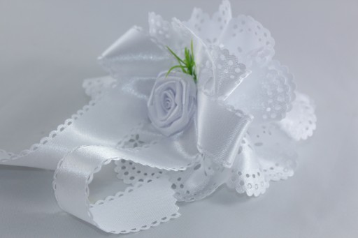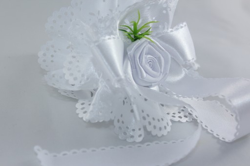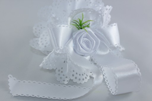 - Biała z atłasową różą i kokardą oraz zieloną gałązką (plastikową)