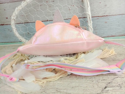 Cudowna nerka z jednorożcem, wykonany z niezwykłą starannością i dbałością o każdy detal. Pięknie ozdobiona mieniącymi kwiatkami 3D. Powyżej znajdują się brokatowe uszy i róg jednorożca, całość wygląda nieziemsko :)