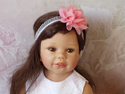 Mamy zaszczyt zaprezentować Państwu śliczną opaskę pochodzącą z naszej pracowni. Opaska wykonana jest z elastycznej białej ozdobnej gumokoronki z szyfonowym kwiatem w kolorze koralowego różu. Gumeczka bardzo się rozciąga dlatego pasować będzie na rozmiar 74/80