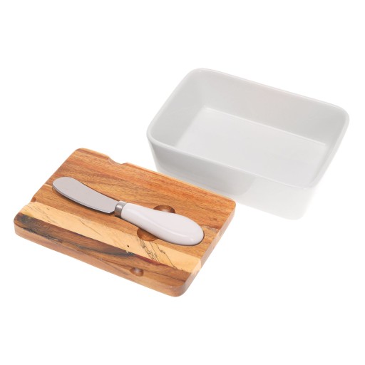 2. Porcelanowa maselniczka KASSEL w kolorze białym z pokrywą wykonaną z drewna akacjowego. W komplecie konturowany nożyk do smarowania z porcelanową rękojeścią. Pokrywka z drewna akacjowego wydłuża świeżość masła.