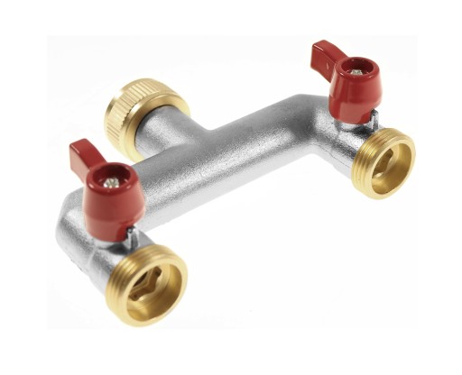 Dwu drożny rozdzielacz z zaworami wykonany z mosiądzu. Posiada jeden gwint wewnętrzny 3/4" i dwa zewnętrzne 3/4" sterowane zaworami. Produkt cechuje się wysoką jakością wykonania i gwarantuje wydajną pracę.
