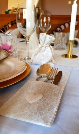 Piękne etui w delikatnych kolorach, obszyte koronką wykonane zostały z wielką starannością. Świetnie nadają się do aranżacji stołu w stylu boho jak i do stylu bardziej klasycznego, dzięki ich prostej formie.