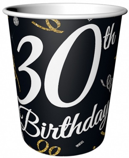Kubeczki papierowe w kolorze czarnym z białym napisem "30th Birthday" - 6 sztuk