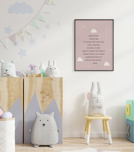 Plakat dla dziecka – Aniele Boży Stróżu Mój. Plakat z modlitwą stanowi idealny pomysł na prezent z okazji narodzin, chrztu świętego czy też komunii świętej. Ta wartościowa pamiątka będzie stanowiła nie tylko piękne dopełnienie pokoju naszej pociechy, ale także stworzy jej świetną okazję do nauki modlitwy i jej odmawiania.