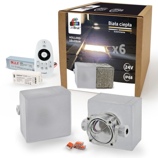 Składniki zestawu: Holland 10x10 - 6 sztuk, zasilacz IP67 - 1 sztuka, ściemniacz z pilotem Milight