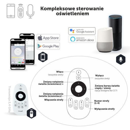 Każdy element systemu oświetlenia (tzw. kontroler) posiada wbudowany moduł komunikacji bezprzewodowej pracujący na częstotliwości 2.4GHz. Nie potrzebuje do działania żadnych dodatkowych urządzeń. Wystarczy, że przypiszesz go do wybranego pilota i gotowe!