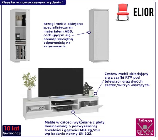Pomimo tego, że czasy się zmieniają i świat idzie do przodu, pewne rzeczy się nie zmieniają. Tak jak odpowiednie wyposażenie salonu, które powinno być wygodne w użytkowaniu, dostosowane do potrzeb użytkowników, ale przede wszystkim estetyczne i trwałe. Taka właśnie jest meblościanka Rimero marki Elior. To cudowne połączenie szafki RTV oraz dwóch wiszących szafek z drzwiczkami - wyposażenie, które idealnie sprawdzi się w salonie. Szafka pod telewizor posiada półki na sprzęt elektroniczny oraz boczne półki z uchylnymi drzwiczkami, idealne do przechowywania płyt DVD. Natomiast wiszące szafki z trzema półkami to dodatkowe miejsce na przechowywanie książek, czy drobiazgów, które zawsze będą pod ręką. Prosty design, gładka forma bez uchwytów oraz stonowane kolory to gwarancja, że meblościanka Rimero idealnie wkomponuje się do pomieszczenia urządzanego w stylu skandynawskim, nowoczesnym czy minimalistycznym.