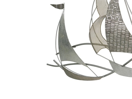 Dodaj swojemu wnętrzu marynistycznego charakteru dzięki tej wyjątkowej dekoracji ściennej. Kompozycja 3D składająca się ze srebrnych łodzi będzie dobrze się prezentować zarówno na ciemnych jak i jasnych ścianach. Całość jest wykonana z dobrej jakości metalu, co gwarantuje stabilność i trwałość. Zawieś ją nad kominkiem, szafką lub sofą i ciesz się pięknem tego ozdobnego elementy, który na pewno przyciągnie wzrok wszystkich gości.