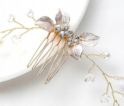 Zachwycająca opaska o nowoczesnym wzorze w postaci delikatnej gałązki. Świetnie sprawdzi się w stylizacjach boho, vintage i rustykalnych. Produkt wykonany ze złotego, cynkowanego drutu, nawijanego na koraliki i perełki. Wytrzymały i plastyczny, dzięki czemu idealnie się układa. Opaskę można zaczepić wsuwkami , ozdoba posiada dwa małe grzebyki