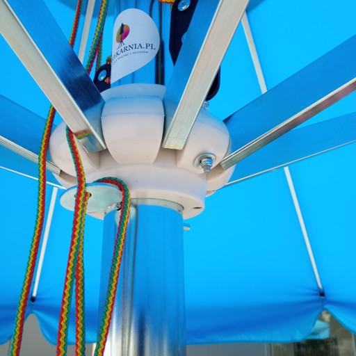 - Solidna rozeta pod poszyciem u szczytu parasola dodatkowo zabezpieczona materiałem chroniącym przed uszkodzeniem materiału