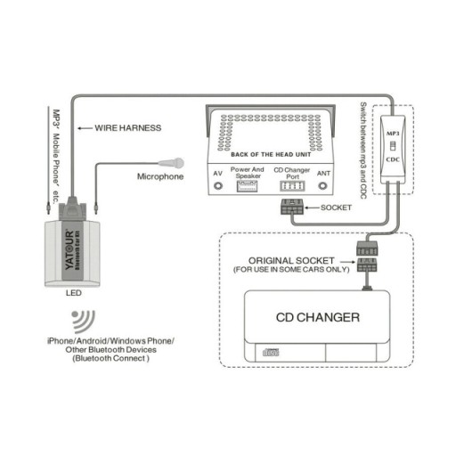 Fabrycznie nowy zestaw głośnomówiący firmy Yatour , umożliwia podłaczenie pod firmowy odtwarzacz w miejsce standartowej zmieniarki , prowadzenie rozmów telefonicznych i przesyłanie muzyki przez bluetooth (protokół A2DP) , z dowolnego urządzenia , telefon , laptop, tablet itd. , urządzenie dysponuje także wejściem aux. do którego możemy podłączyc dowolne urządzenie .