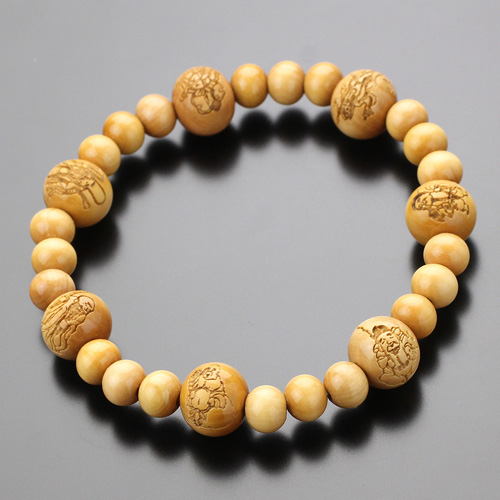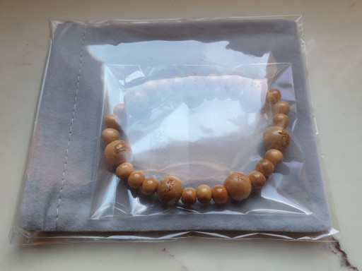 Materiał to TSUGE (naturalne drewno; japoński bukszpan) - koraliki będą służyć przez wiele lat. Producent prosi o unikanie wilgoci i wody - w innym przypadku elastyczna guma (tkana włóknami - jest kilkukrotnie bardziej trwalsza niż pojedyncza guma) łącząca koraliki może ulec zniszczeniu.