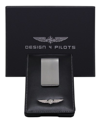 Z przodu portfela na karty, powyżej srebrnego metalowego skrzydełka - logo Design 4 PILOT® - znajduje się wykonany ze stali nierdzewnej klips na banknoty.