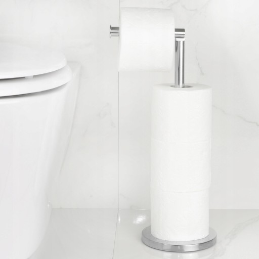 Praktyczny stojak 2w1 z uchwytem na papier oraz miejscem na zapasowy papier toaletowy. Stojak łącznie mieści do 4 rolek papieru.
