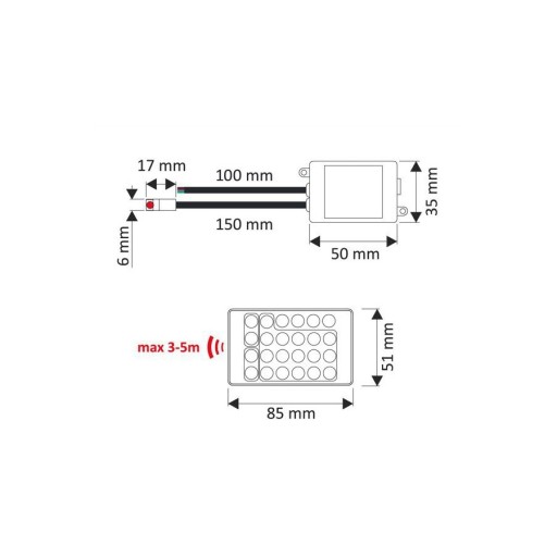 Pilot działa w zasięgu do 5 m. Temperatura pracy sterownika wynosi od –20 do 60 °C. Natężenie: 3x2A (< 2A na jeden kolor). Maksymalna moc: 72W.