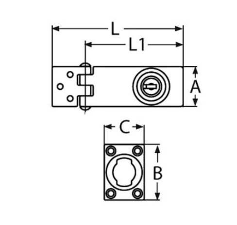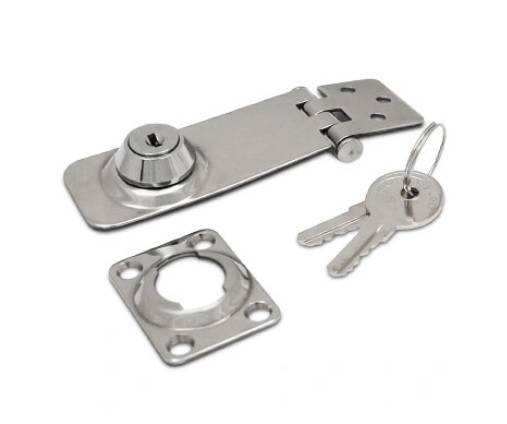 Łatwe w montażu zamknięcie zawiasowe na klucz, wykonane ze stali nierdzewnej. Zamek patentowy z dwoma kluczami. Do zastosowania w bakistach, suwklapach itp.