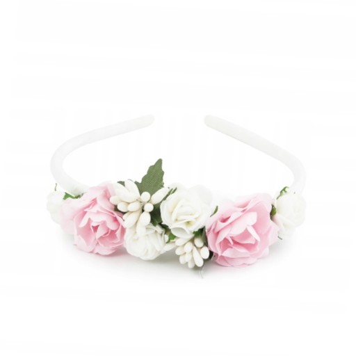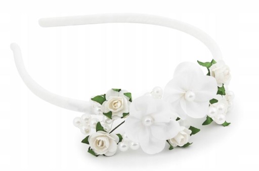 Prześliczna biała opaska wykonana z białych kwiatów tiulowych w połączeniu z satyną wraz z ozdobnymi perełkami w kolorze bieli podkreślając czystość, delikatność i niewinność dziewczynki.