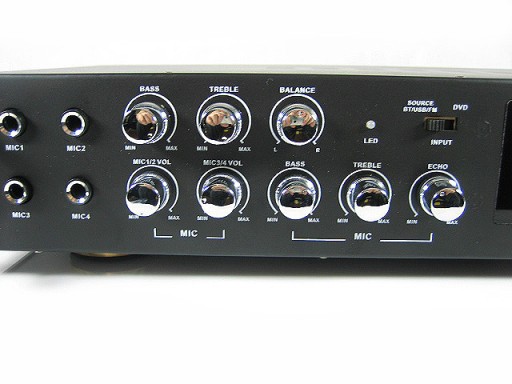 Wzmacniacz posiada cztery wejścia mikrofonowe oferując niezłą zabawę karaoke.