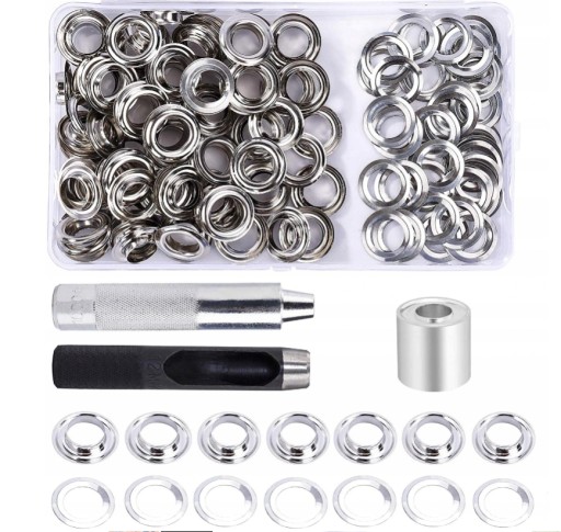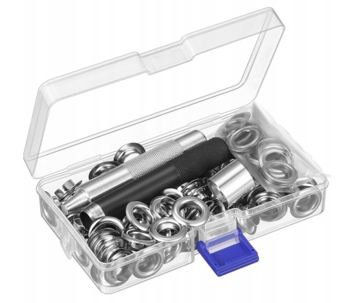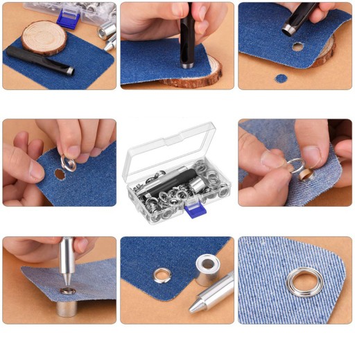 Wiele kombinacji: zestaw przelotek zawiera wycinak do otworów, pasujący trzpień i 100 zestawów otworów przelotek (każdy zestaw zawiera 1 oczko i 1 podkładkę) oraz schowek