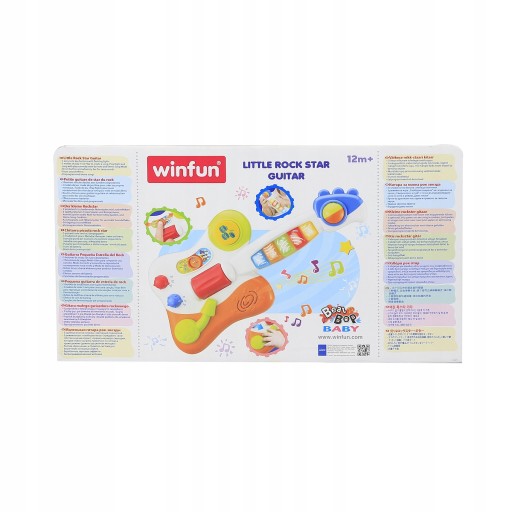 Zabawka działa jak proste pianinko - gryf gitary wyposażony jest w 5 kolorowych klawiszy, które po wciśnięciu uruchamiają melodie i mrugają wesoło światełkami. Zabawka oferuje 3 tryby zabawy oraz 3 możliwości wyboru tonacji melodii.