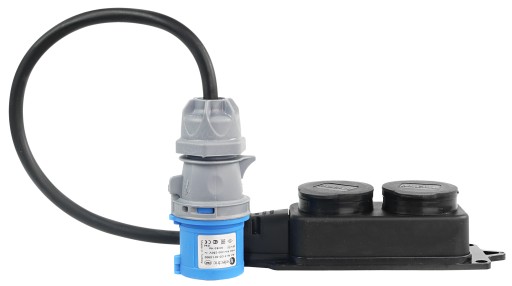 Wykonany z elastycznego przewodu w gumie (H05RR-F) 3x2,5mm², o długości całkowitej ok. 50 cm, oraz bardzo wytrzymałej wtyczki 16A 3P oraz listwy z klapkami 230V.