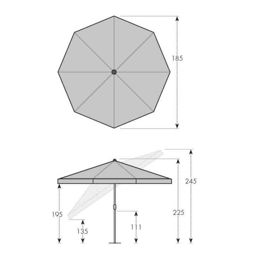Parasol z możliwością pochylania czaszy na 2 strony umożliwia to łatwe dopasowanie do położenia słońca. Czasza parasola jest wykonana z odpornej na warunki pogodowe tkaniny poliestrowej, z dobrą odpornością na światło i dobrą ochroną UV 50+.