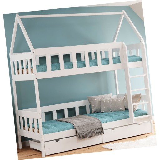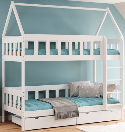 Łóżko Gigi 4X to mocna drewniana konstrukcja w kształcie prawdziwego domku. Dzieci kochają takie rozwiązania. Zachęć swoje maluchy do spania we własnym pokoju tym komfortowym i zaprojektowanym specjalnie dla nich meblem, który wytrzyma wszystkie dziecięce zabawy. W komplecie z łóżkiem otrzymasz dwa wygodne materace, tak by Twoje dzieci mogły od razu po złożeniu korzystać z nowego posłania. Mocna drewniana drabinka ułatwi wchodzenie na górę, a konstrukcja w kształcie dachu domku to świetne miejsce do zawieszenia kolorowych lampek czy dziecięcych zabawek. Bezpieczeństwo Twoich dzieci w trakcie spania gwarantuje też zestaw barierek, które zapobiegną spadnięciu maluchów na ziemię. Wybierz jakość, która da Ci zadowolenie z mebla i spokojny sen Twoich dzieci w jednym.