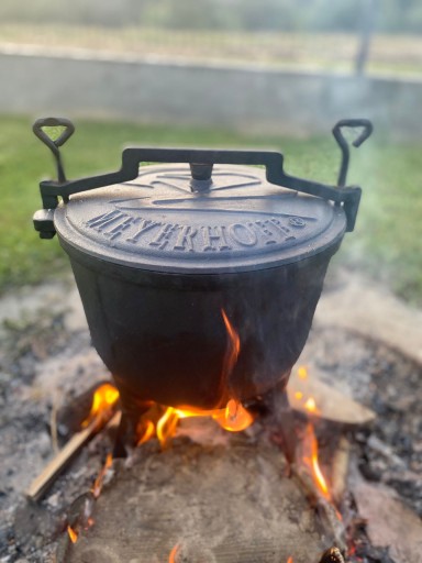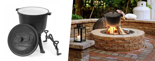 Oryginalny kociołek Meyerhoff wykonany z najwyższej jakości stopu żeliwa odpornego na najwyższe temperatury. Specjalny odpowietrznik w pokrywie, który reguluje ciśnienie wewnątrz kociołka, przez co jest on w 100% bezpieczny. W środku pokryty żaroodporną emalią, która chroni i zabezpiecza wnętrze kociołka, dodatkowo ułatwiając jego mycie i konserwacje (nie ma potrzeby impregnowania po każdym użyciu). Kociołek może stać bezpośrednio w ognisku, a dzięki poręcznemu uchwytowi może być zawieszony również nad ogniskiem. Produkt posiada również odkręcane nóżki, przez co kociołek można umieścić w kominku lub bezpośrednio w palenisku. Dzięki wytłoczeniu na pokrywie masz pewność, że kupujesz oryginalny i bezpieczny produkt.