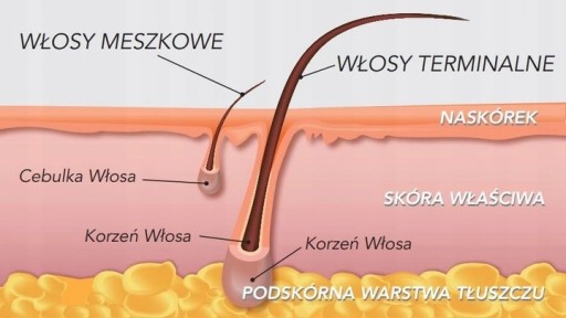 - Włosy pokrywające ludzkie ciało w większości są małe i bezbarwne. Są to włosy meszkowe (typu Vellus) i pomagają regulować temperaturę ciała. Korzeń włosa meszkowego znajduje się blisko powierzchni i ma małą cebulkę. Natomiast włosy znajdujące się w kilku obszarach, takich jak owłosiona skóra głowy, brwi, rzęsy, broda, pachy, tułów i obszar bikini są grubsze, dłuższe, mają więcej pigmentu i nazywane są włosami terminalnymi. Cebulka włosa terminalnego znajduje się znacznie głębiej w skórze i jest znacznie większa w porównaniu do włosów meszkowych.