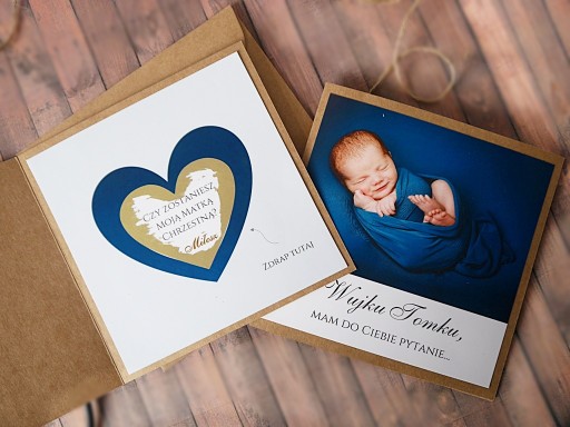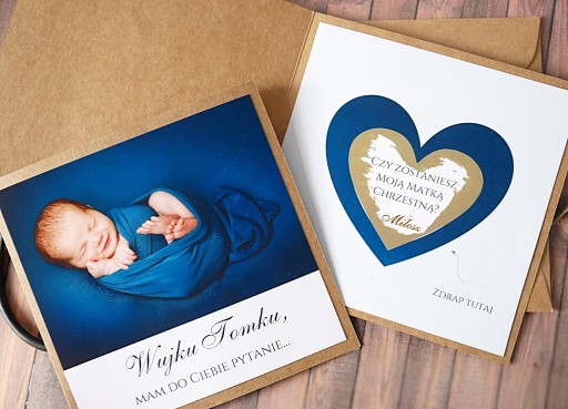 - W środku kolorystka dopasowana do zdjęcia, pod zdrapką napis Czy zostaniesz moim Ojcem Chrzestnym + imię dziecka / Czy zostaniesz moją Matką Chrzestną + imię dziecka