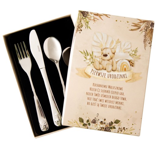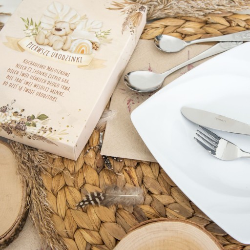 Oferujemy Państwu produkt idealnie nadający się jako prezent z okazji pierwszych urodzinek. Produkt, który spełni oczekiwania najbardziej wymagającego klienta. Sztućce dziecięce zapakowaliśmy w pudełko, które posiada "coś", czego nie można pokazać na zdjęciach! Pokryliśmy je folią "soft-touch". Dzięki temu mamy wrażenie dotykania jedwabiu lub aksamitu. Takie nasze małe arcydzieło :)