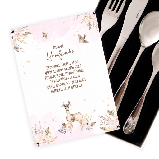 Oferujemy Państwu produkt idealnie nadający się jako prezent z okazji Roczku. Produkt, który spełni oczekiwania najbardziej wymagającego klienta. Sztućce dziecięce zapakowaliśmy w pudełko, które posiada "coś", czego nie można pokazać na zdjęciach! Pokryliśmy je folią "soft-touch". Dzięki temu mamy wrażenie dotykania jedwabiu lub aksamitu. Takie nasze małe arcydzieło :) W zestawie kartka z życzeniami zaprojektowana w takim samym motywie graficznym.