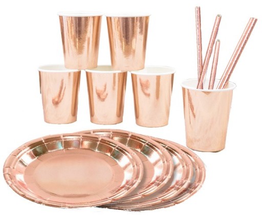 Talerzyki kubeczki słomki zestaw na stół Rose Gold