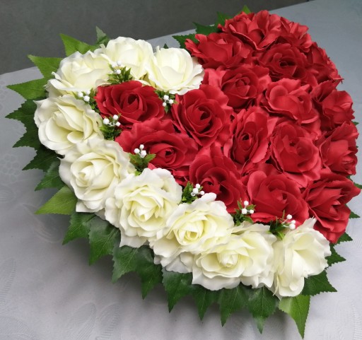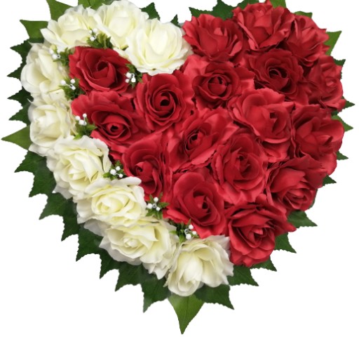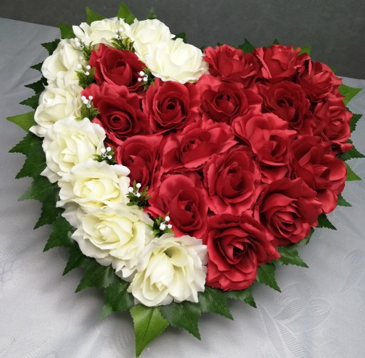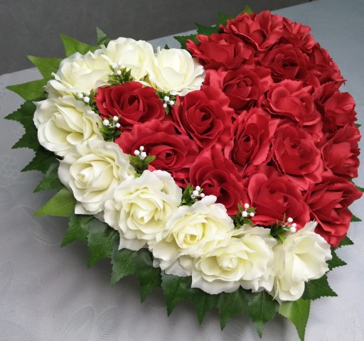 Serce ozdobione recznie z wysokiej jakosci sztucznych kwiatow, umocowane w donicy zalanej betonem.