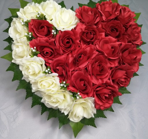 Serce ozdobione recznie z wysokiej jakosci sztucznych kwiatow, umocowane w donicy zalanej betonem.