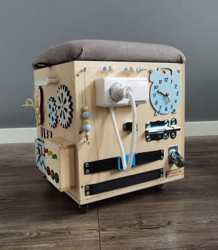 Każdy bok skrzyni to inne aktywności dla dziecka.