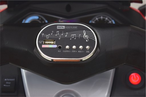- dźwięk - głos pracy silnika motoru, nowoczesny panel z wgranymi melodiami i opowieściami, wejście na USB. MP3