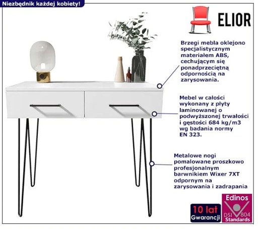 Optymalna temperatura do przechowywania szminki wynosi 20-25°C. Nie trzymaj pomadki w lodówce, bo skracasz jej żywotność (wtedy jej stabilność to ok. 2-3 miesiące), kiedy standardowa żywotność to ok. 3 lata. Najlepiej, kiedy kosmetyki zawsze są pod ręką niezależnie, czy mówimy tutaj o szmince, kremie pod oczy, podkładzie, czy tuszu do rzęs. Z toaletką Saris marki Elior ciągłe poszukiwania pomadki, czy błyszczyka w torebce bez dna pójdą w zapomnienie! Cudowna biel kontrastująca z głęboką czernią uchwytów oraz fantazyjnych nóg to design, który pokochasz od pierwszego wrażenia. Dzięki niebanalnej formie toaletka Saris idealnie wkomponuje się do sypialni urządzonej zarówno w stylu skandynawskim, nowoczesnym, czy klasycznym. Poczuj szczyptę elegancji! Zaszalej i zdecyduj się na toaletkę Saris marki Elior, a Twój poranny makijaż stanie się prawdziwą przyjemnością!