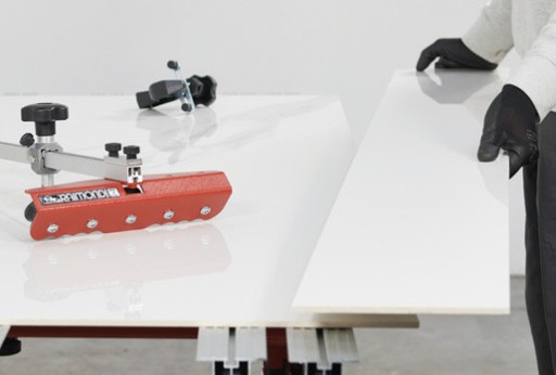 - Wykonując nacięcia, trzymaj T-CUT na krawędzi i przesuwaj go po krawędzi boku na całej długości płyty, jednocześnie naciskając na wózek z kółeczkiem tnącym.