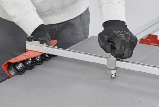- Do wykonania cięcia można użyć urządzenia umieszczając kółka na krawędzi płytki (do cięć równoległych) lub alternatywnie na krawędzi stołu warsztatowego (do cięć ukośnych).