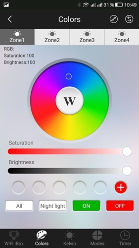 Odbiornik umożliwia zmianę koloru, zmianę trybów dynamicznych, włączenie/wyłączenie, ściemnianie/rozjaśnianie oraz dostosowanie temperatury barwy białej.