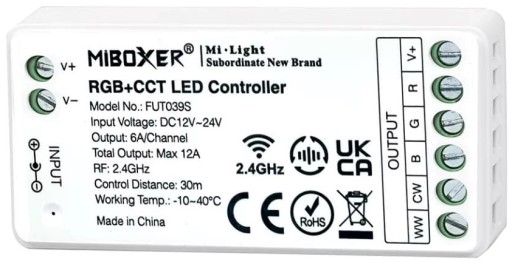 Kontroler FUT039S jest przeznaczony do obsługi taśm LED RGB+CCT 6-pin. Nie należy stosować tego kontrolera z taśmami innego typu, ponieważ może to skutkować jego nieprawidłową pracą.