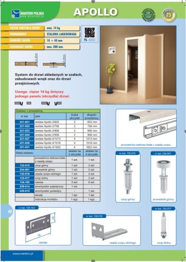 Przedmiot sprzedaży: komplet okuć APOLLO wraz z szyną 908mm do drzwi łamanych (2 skrzydła).