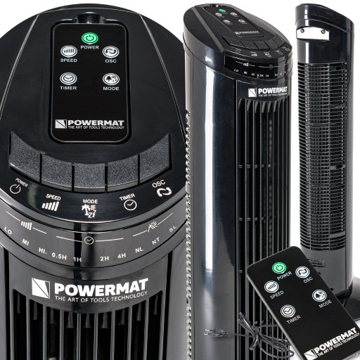 Wentylator kolumnowy (wieżowy) marki POWERMAT model Black Tower-75 z racji swoich wymiarów (wysokość 74cm) siła dmuchania jest większa przy mniejszej prędkości obrotowej. Dzieki takim wymiarom wentylator jest cichszy niż mniejsze wersje.